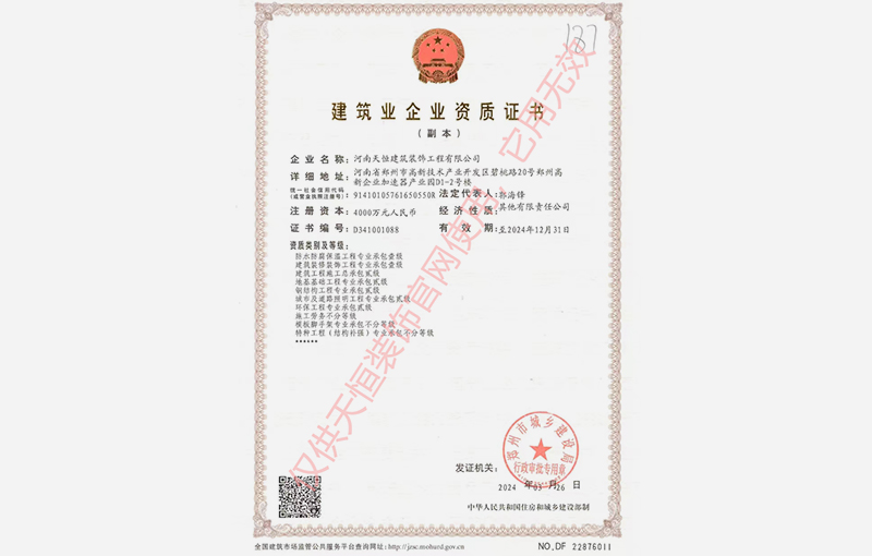 河南天恒建筑裝飾工程有限公司成立于2004年,注冊資金4000萬元,擁有正規(guī)的建筑裝飾工程設計專項乙級、建筑裝修裝飾工程專業(yè)承包壹級、防水防腐保溫工程專業(yè)承包壹級、地基基礎工程專業(yè)承包貳級、建筑工程施工總承包貳級、鋼結構工程專業(yè)承包貳級、城市及道路照明工程專業(yè)承包貳級、環(huán)保工程專業(yè)承包貳級等多個建筑業(yè)企業(yè)資質(zhì)。